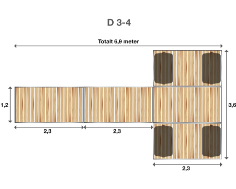 Brygga D 3-4 är så rymlig att du med lätthet rymmer 2 bänkar. Bänkarna monteras fast med bultar mellan springorna i trädäcket. Bänkarna på bilden är 2 meter breda.