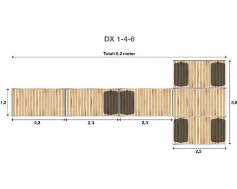 Brygga DX 1-4-6 är så rymlig att du med lätthet rymmer 2 bänkar. Bänkarna monteras fast med bultar mellan springorna i trädäcket. Bänkar du monterar på brygga DX 1-4-6 står alltid i våg p.g.a. gångjärnet på bryggans landgång. Bänkarna på bilden är 2 meter breda.