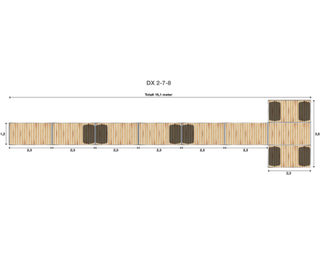 Brygga DX 2-7-8 är stor och rymlig och du rymmer lätt 2 bänkar. Bänkarna monteras fast med bultar mellan springorna i trädäcket. Bänkar du monterar på den här bryggan står alltid i våg tack vare gångjärnen på bryggans landgång. Bänkarna på bilden är 2 meter breda.