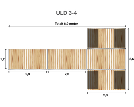 Brygga Ulpukka ULD 3-4 är en brygga med en totallängd på 6.9 meter. Den består av 5 sektioner, vardera 1.2 m x 2.3 m. Den extra stora och mycket stabila bryggdelen längst ut mäter hela 3.6 m x 2.3 m och gör bryggan väldigt rymlig, och tryggare att vistas på än en mindre.