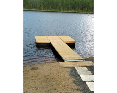 Komplett flytbrygga med kombinerat land- och bergfäste. Extra stor och mycket stabil bryggdel längst ut.